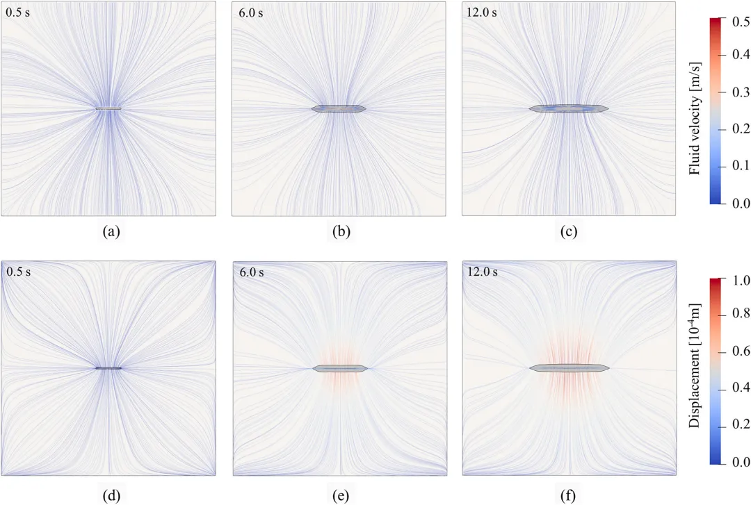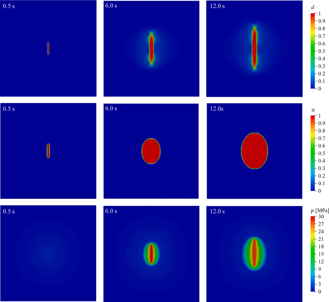 多物理场统一框架:基于FVM统一离散固体相场方程与流体Navier-Stokes方程,在GPU端实现了脆性断裂与两相流体的紧密耦合(tightly coupled),为求解流–固耦合断裂问题提供了高效的统一数值平台。