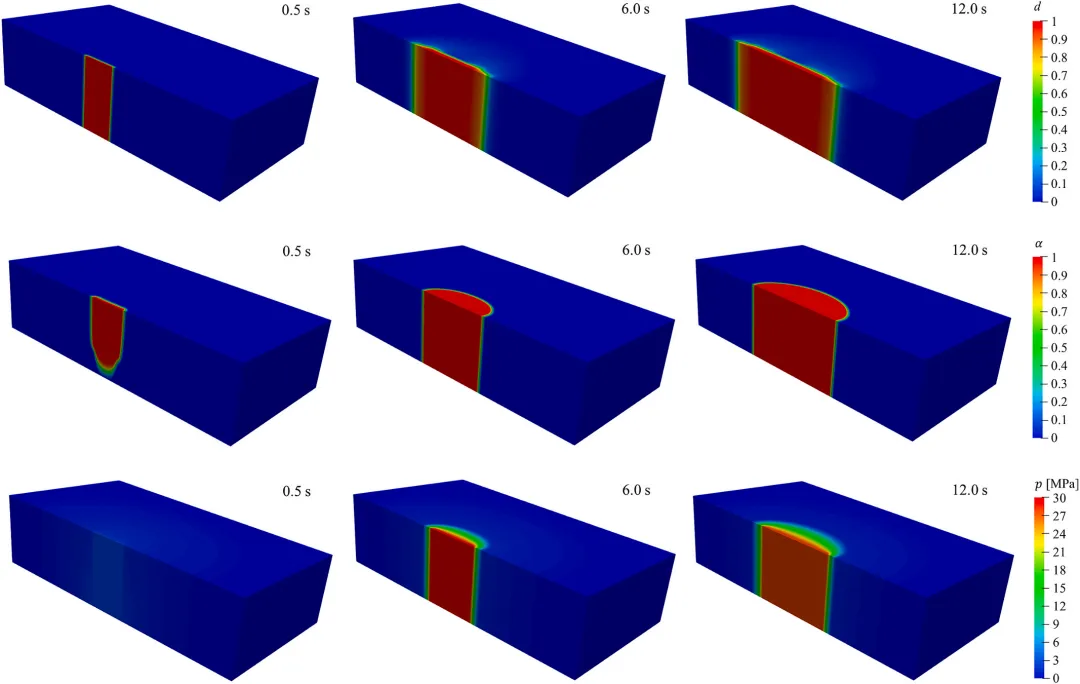 相场法通过将离散裂纹转化为连续的相场变量,避免了传统方法中裂纹面追踪的几何复杂性,已成为模拟复杂断裂行为的有力工具。然而,该方法需引入正则化长度尺度参数,要求在整个计算域进行精细空间离散,且交错求解位移场与相场需大量迭代,导致计算成本极高,成为制约其工程应用的关键瓶颈。现有GPU加速研究多集中于粒子法(如SPH、DEM)或扩展有限元法(XFEM),而针对非结构化网格的隐式FVM框架的GPU并行化研究相对匮乏,且既有异构计算方案需频繁进行CPU-GPU数据传输,难以充分发挥GPU硬件潜力。此外,水力压裂、CO₂封存等岩土工程问题涉及固–液–气多相耦合、高度非线性的裂纹动态扩展,对计算效率和数值方法的统一性提出了更高要求。