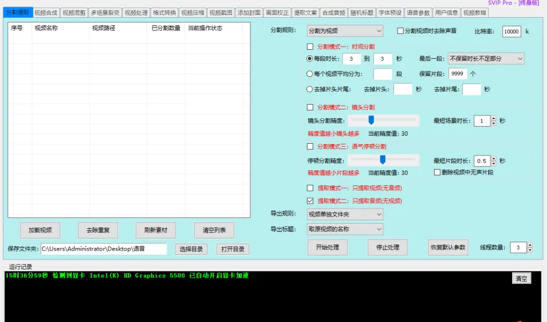 在视频素材基础处理方面,工具支持灵活的分割提取功能,既能按时长、段数分割提取,也能依据镜头转场、语音语句分割提取。还支持单独提取视频或音频。
