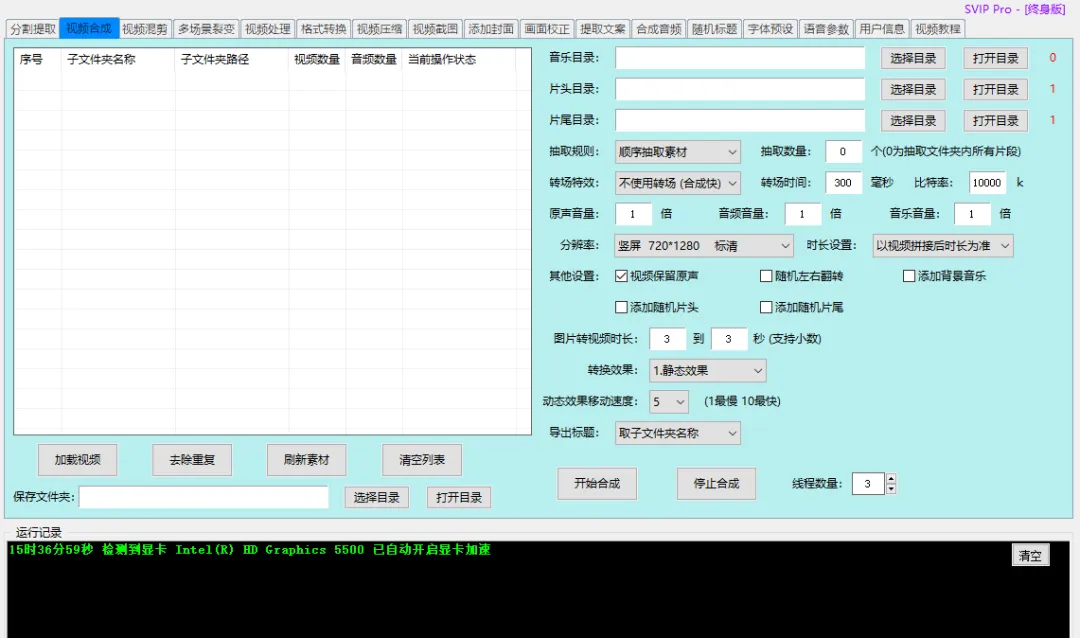 视频合成可自动整合文件夹内的音视频素材,支持添加转场特效、背景音乐,还能随机翻转画面、增设片头片尾。