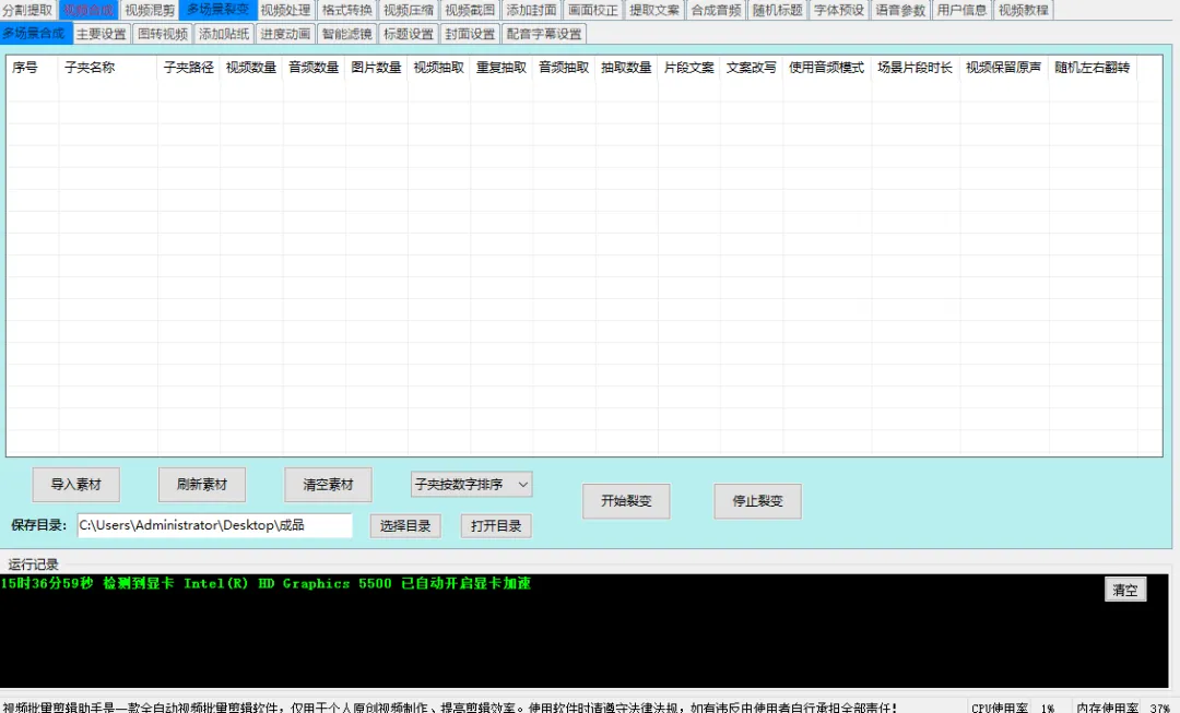 还有多场景裂变功能,能从多场景文件夹中随机抽取片段,经预处理后合成新视频,搭配自定义音乐、贴纸、片头片尾等设置,轻松实现视频内容裂变。