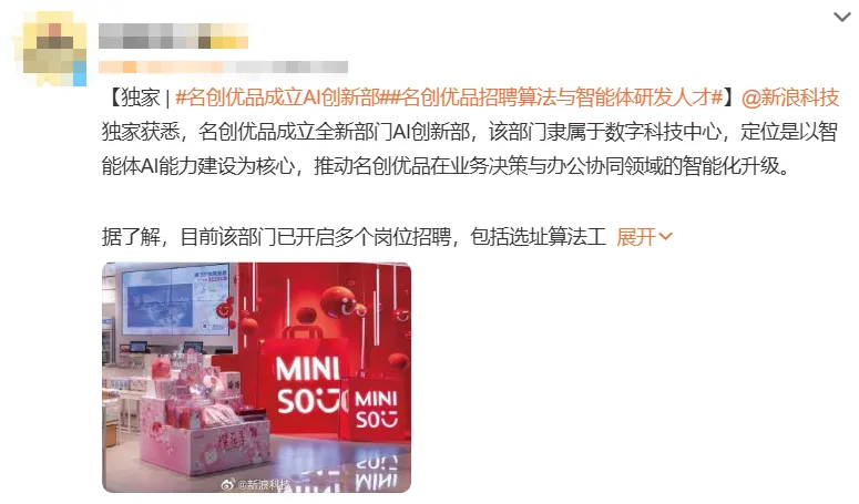 据消息显示,某创优品最近悄悄成立了AI创新部,隶属于数字科技中心,目前已经开启大规模岗位招聘,诚意满满。