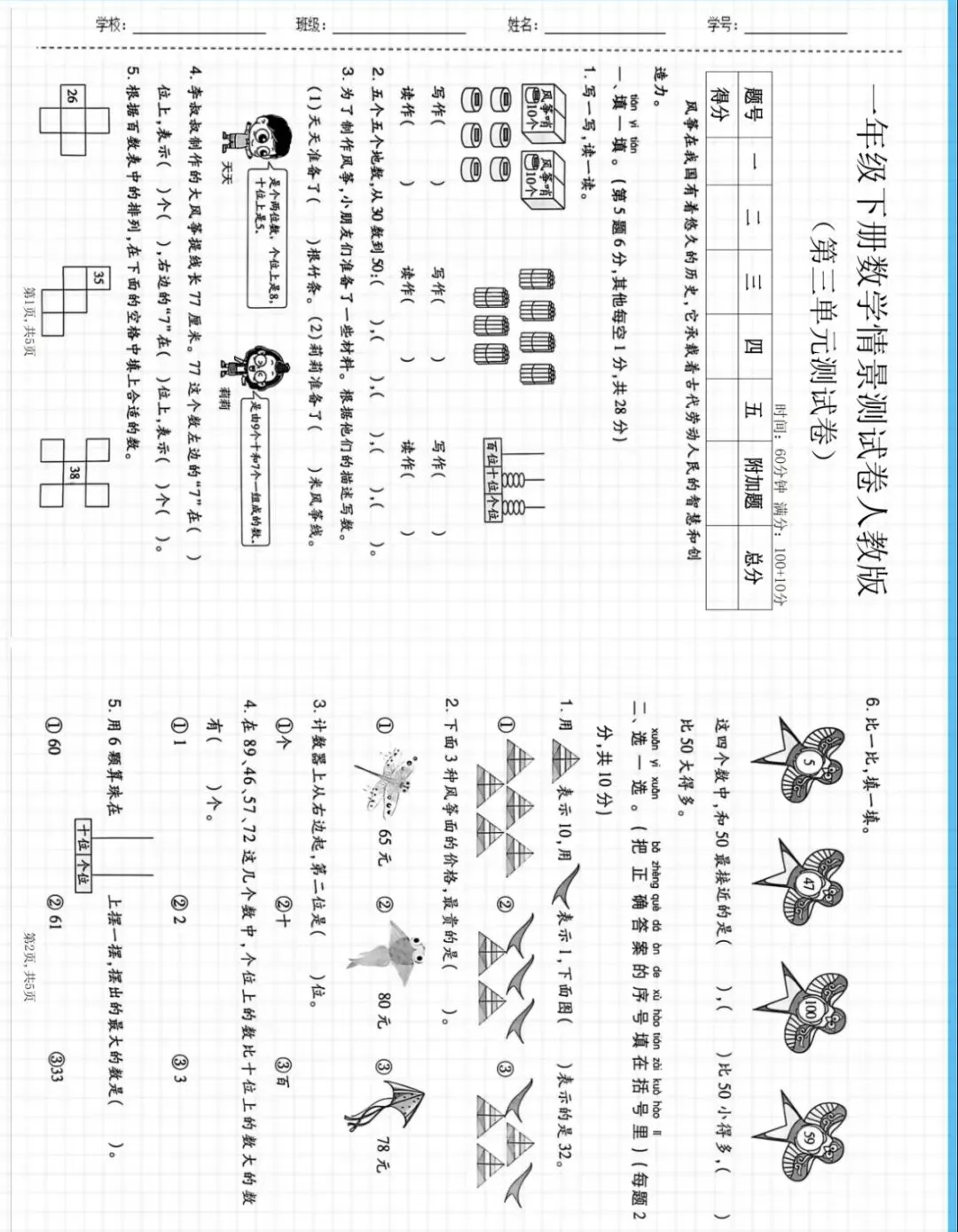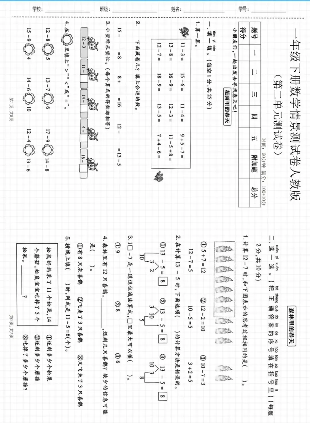 一下人教版数学二三单元练习卷(可打印)