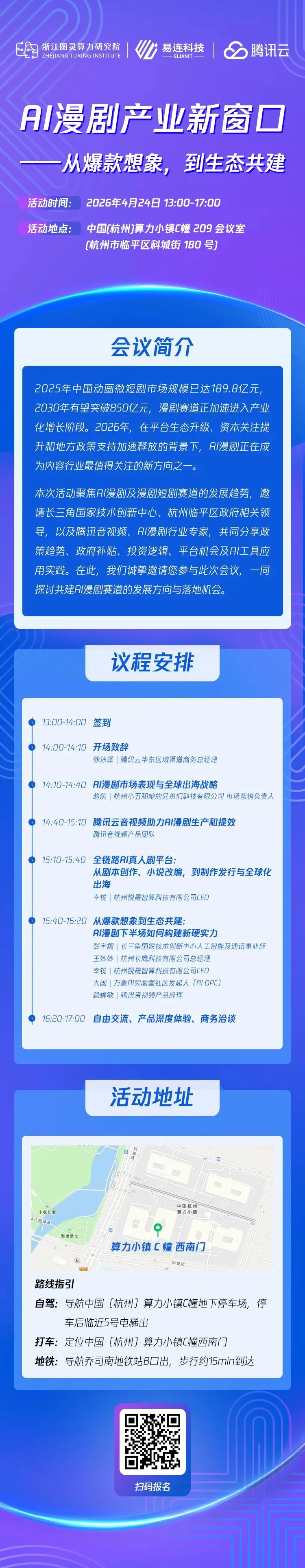 浙江图灵算力研究院*腾讯云:解锁AI漫剧产业新窗口,报名通道已开 来源丨浙江图灵算力研究院 杭州临平算力小镇 企服热线0571-89150826 / 0571-89150823 浙江省杭州市临平区乔司街道科城街180号