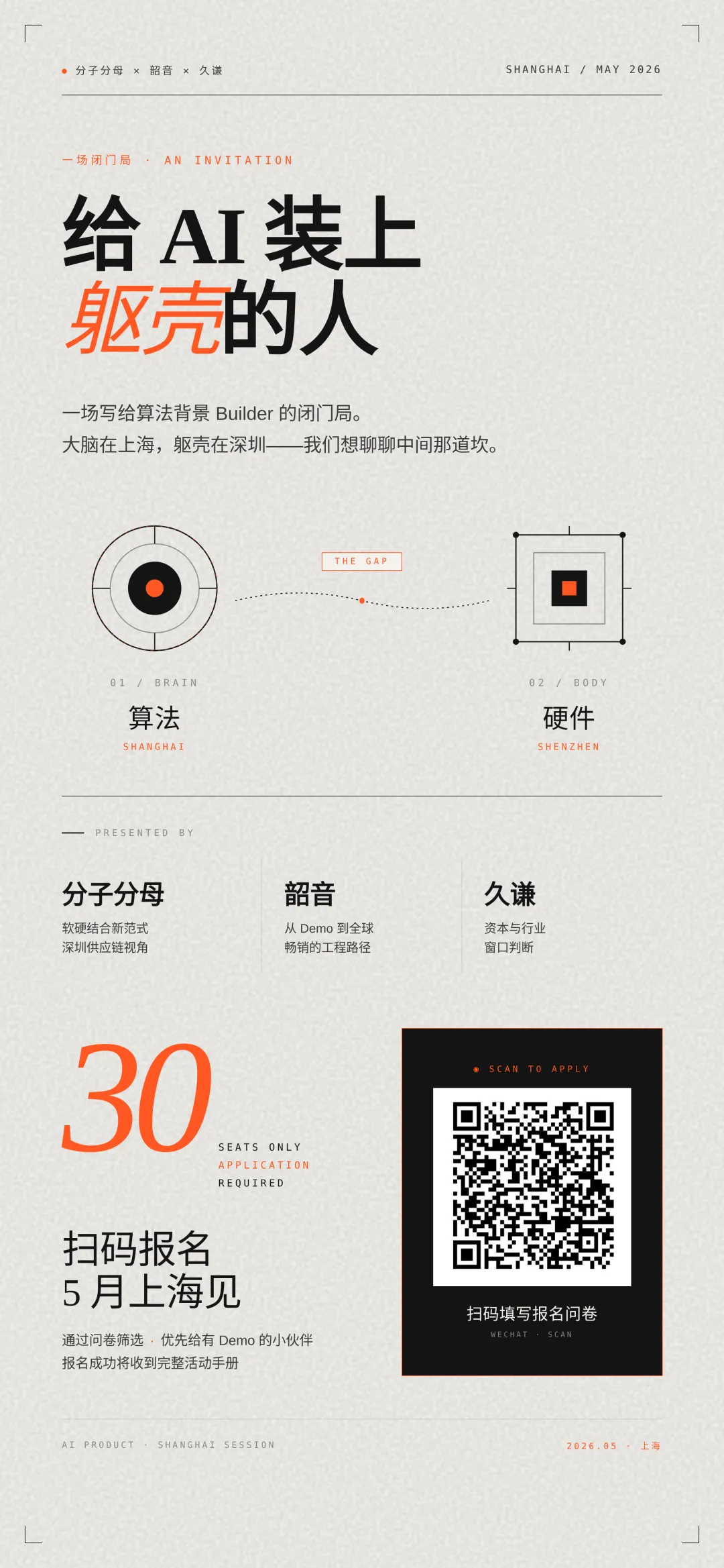 总共 30 个名额,我们会通过问卷认真筛选。问卷本身也是一次对齐——你会看到我们关心的问题,我们会看到你在做的事。
