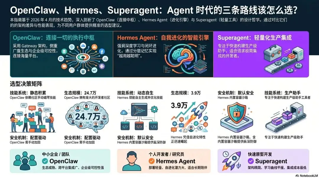 选择OpenClaw、Hermes还是Superagent,本质是选择你的技术哲学与发展路线: