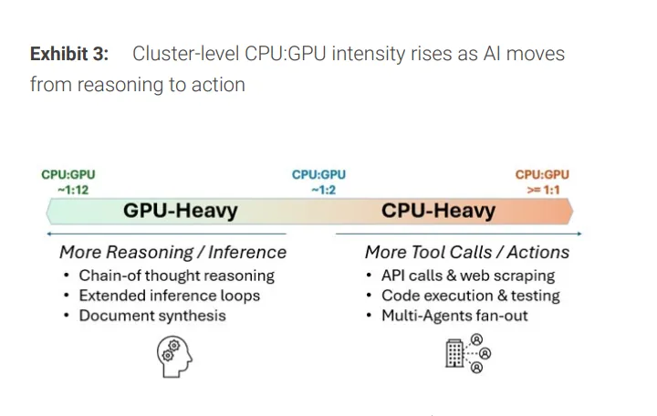 智能体的运作逻辑截然不同。完成一个任务,系统需要经历规划、检索、调用外部工具与API、执行、反思迭代等多个步骤,还涉及多智能体协作、权限管理、状态持久化与调度等大量“控制面”能力。大摩的核心结论是:智能体带来的不是更”重”的单次推理,而是更多步骤、更多状态、更多协调,而这些工作天然更适合CPU处理。
