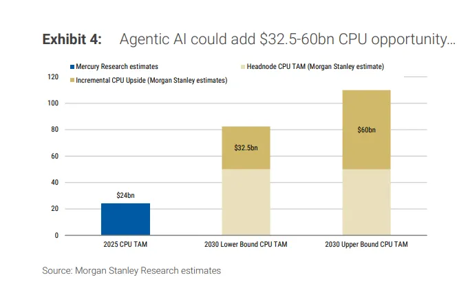摩根士丹利采用“系统分层”方法,将智能体带来的CPU机会从传统服务器更新换代逻辑中剥离,建立三个独立分析口径: