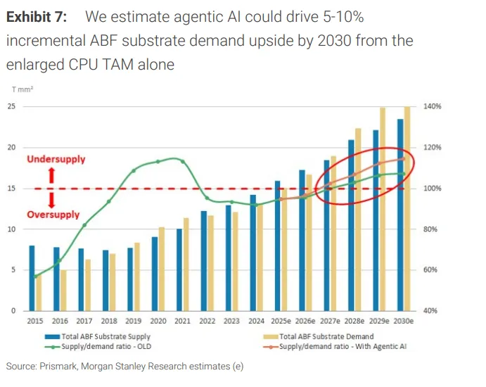 ABF载板:这轮AI驱动的ABF上行周期可能延续至本十年末,2026至2027年附近存在供需缺口风险。仅”CPU TAM扩大”一项,就可能带来2030年ABF需求5%至10%的上修;其中服务器CPU ABF载板市场到2030年约达47亿美元,CPU带来的增量需求约12亿美元。