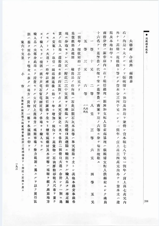 在日本帝国主义侵华史上,南满洲铁道株式会社(简称满铁)是一个有着十分重要地位和特殊作用的殖民侵略机构。满铁是1906年日本政府为经营从沙俄手中攫取来的南满铁路及矿山而下令设立的,到1945年随日本战败投降而消亡。满铁在四十年时间里,依靠掠夺中国东北经济资源的手段,将自己发展成为二十世纪上半期日本最大的企业。作为国家垄断的资本主义企业,满铁不但追逐高额利润,还在经营铁路的同时,经营矿山、其他工业及农牧业,并从事社会调查、资源调查等活动。辽宁省档案馆馆藏中存有满铁不同时期的调查资料,这些资料是研究日本侵华史、满铁史、中国近现代史最原始、珍贵的素材。本史料汇编收集了满铁各调查机构形成的千余种调查报告。第三辑(1909年-1925年)主要是满铁调查课形成的调查资料。调查课是满铁于1907年3月设立的第一个调查机构,其工作任务是“着手一般经济调查以及满蒙旧惯调查”。调查课成立初期没有可以依据的资料,其调查活动是以调查员实地勘查为主,进行民商事习惯、法制、商工、交通、地方经济的调查等。
