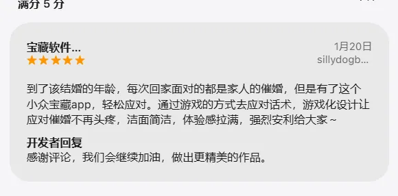 哪怕只有三条评论,每条都是活生生的人。催婚App有条评论说“年年被催婚,真的好烦又不知道该怎么办。直到现在有了催婚app,完美解决我的问题。”,我当时心里一紧——后来新增了“反催婚语录”功能,希望帮用户更好地跟父母对话,而不是逃避。
