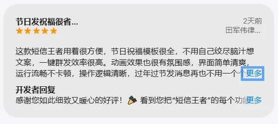 前几天有个粉丝给短信王者App留言,说:“这款短信王者用着很方便,节日祝福模板很全,不用自己绞尽脑汁想文案,一键群发效率很高。动画效果也很有氛围感,界面简单清爽,运行流畅不卡顿,操作逻辑清晰,过年过节发消息再也不用一个个编辑了,隐私安全也让人放心,日常发通知、送祝福都很合适,性价比不错。”