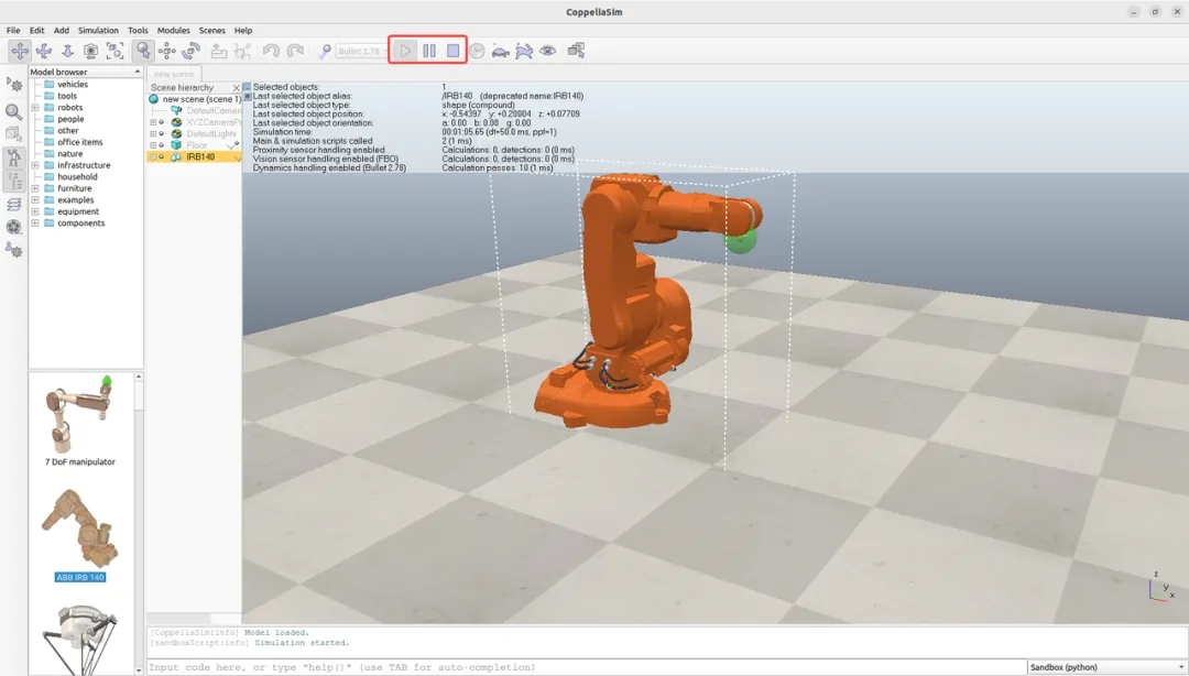 将模型拖拽到主界面中,若模型出现在仿真界面里,说明模型导入成功。点击上方的三角形播放按钮即可进行仿真,若以上步骤没有报错,说明coppeliaSim已经正确安装,可以进行仿真任务了。