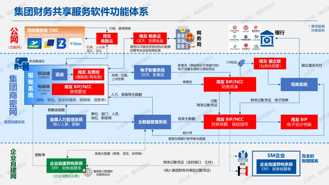 如果企业已经自建了税务管理系统(国资委在共享财务中对税务管理系统也给出了明确的指导意见),此时可能面临一个选择,因为报账系统产品自己拥有配套的验真等发票功能(OCR、税局端验真),是原厂一体化的,如果改为调用企业自建税务系统的相关功能就需要对报账系统做一定的改造,一定程度上破坏了报账系统固有功能体系且带来改造及后续运维的费用,而报账系统验真等发票功能本身费用很低且透明,同时报账涉及的发票数据和数据使用的方法敏感度也都很低,所以是否需要改造报账系统的发票功能可能需要更多评估。如图1中就没有对报账系统做发票接口的功能改造(没有采用统建税务系统的发票接口功能),直接使用了报账系统原厂的发票功能体系(用友税务云)。