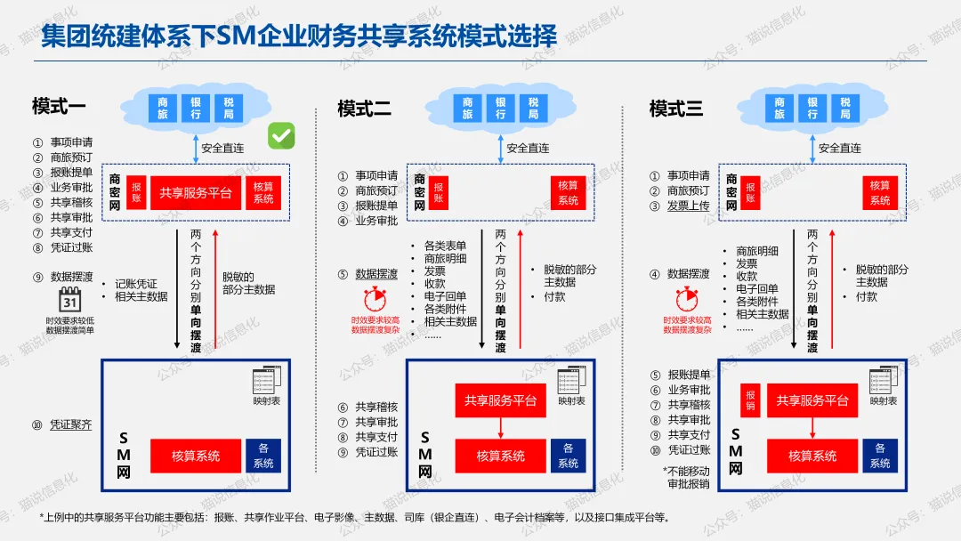 在集团层面,如果集团的业务大部分都是特殊业务,那么上述财务共享系统可能大部分都建设在特殊网信环境中;而对特殊业务只占局部的集团,财务共享系统主要建设在商密网信环境中(如图1)。总体上,主要有三种模式(如图5)。