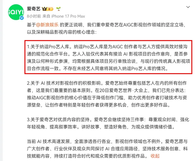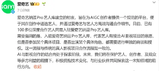 面对舆论海啸,爱奇艺不得不紧急降温,连续澄清入库仅代表艺人有合作接洽意向,并非完成AI商用授权,会严格遵守肖像权、人格权相关法规,这场仓促的技术官宣,最终沦为一场口碑崩盘的公关灾难。