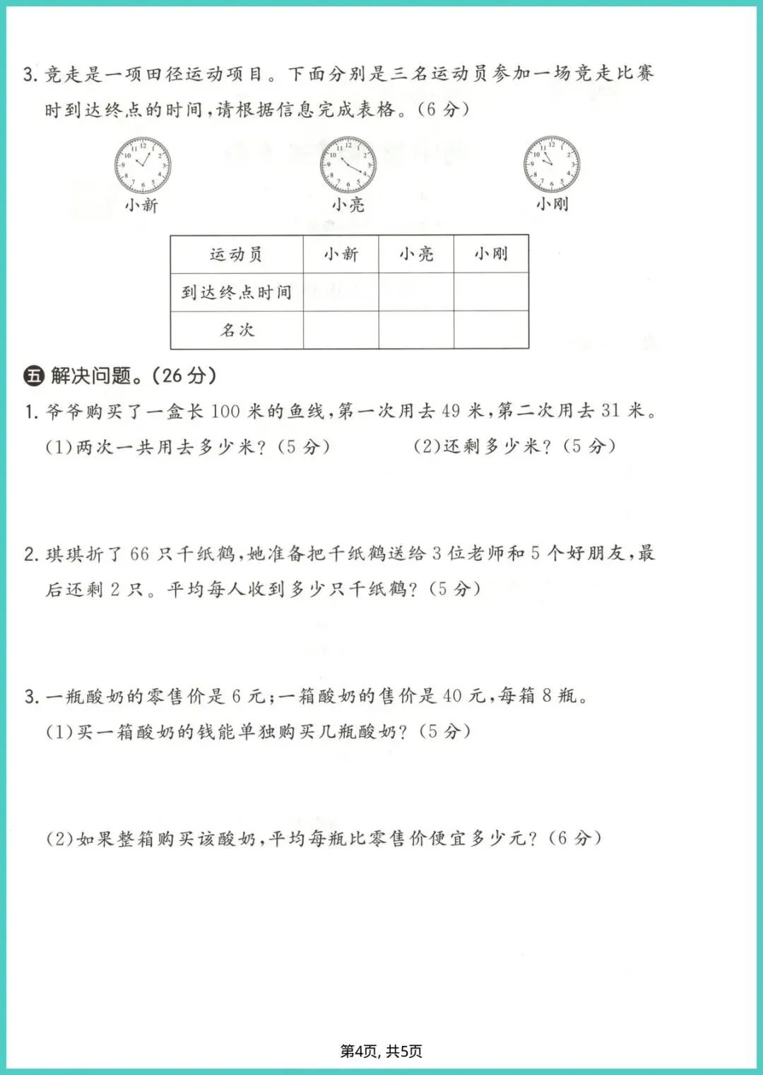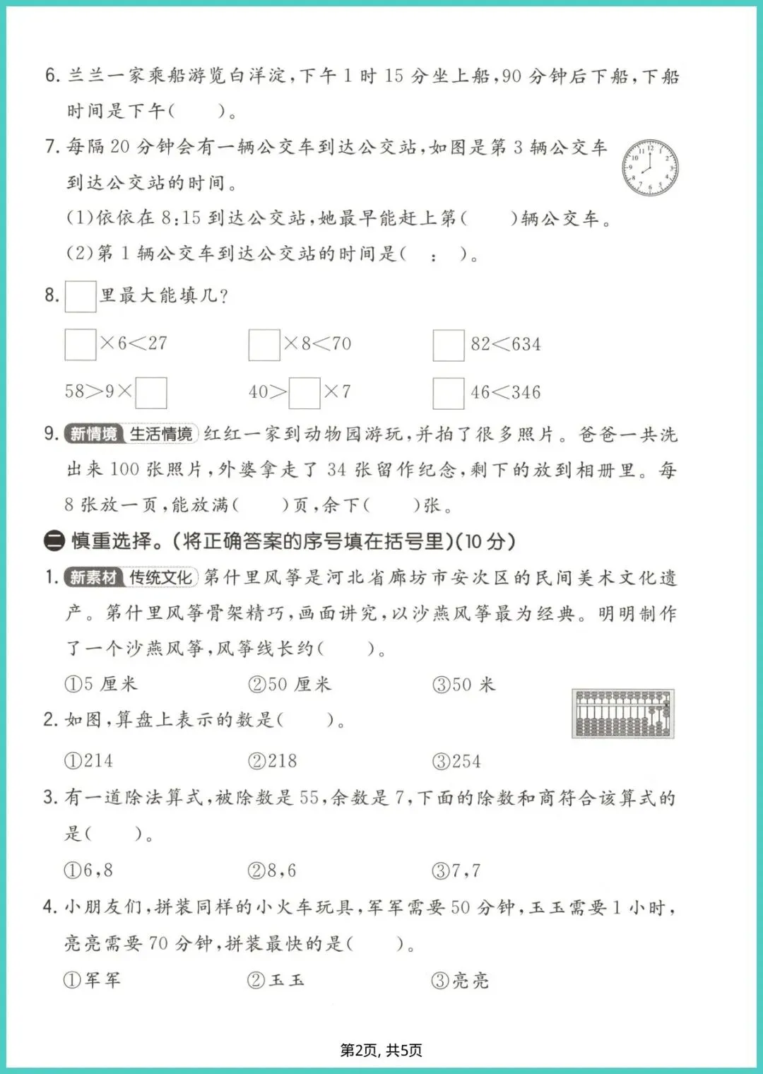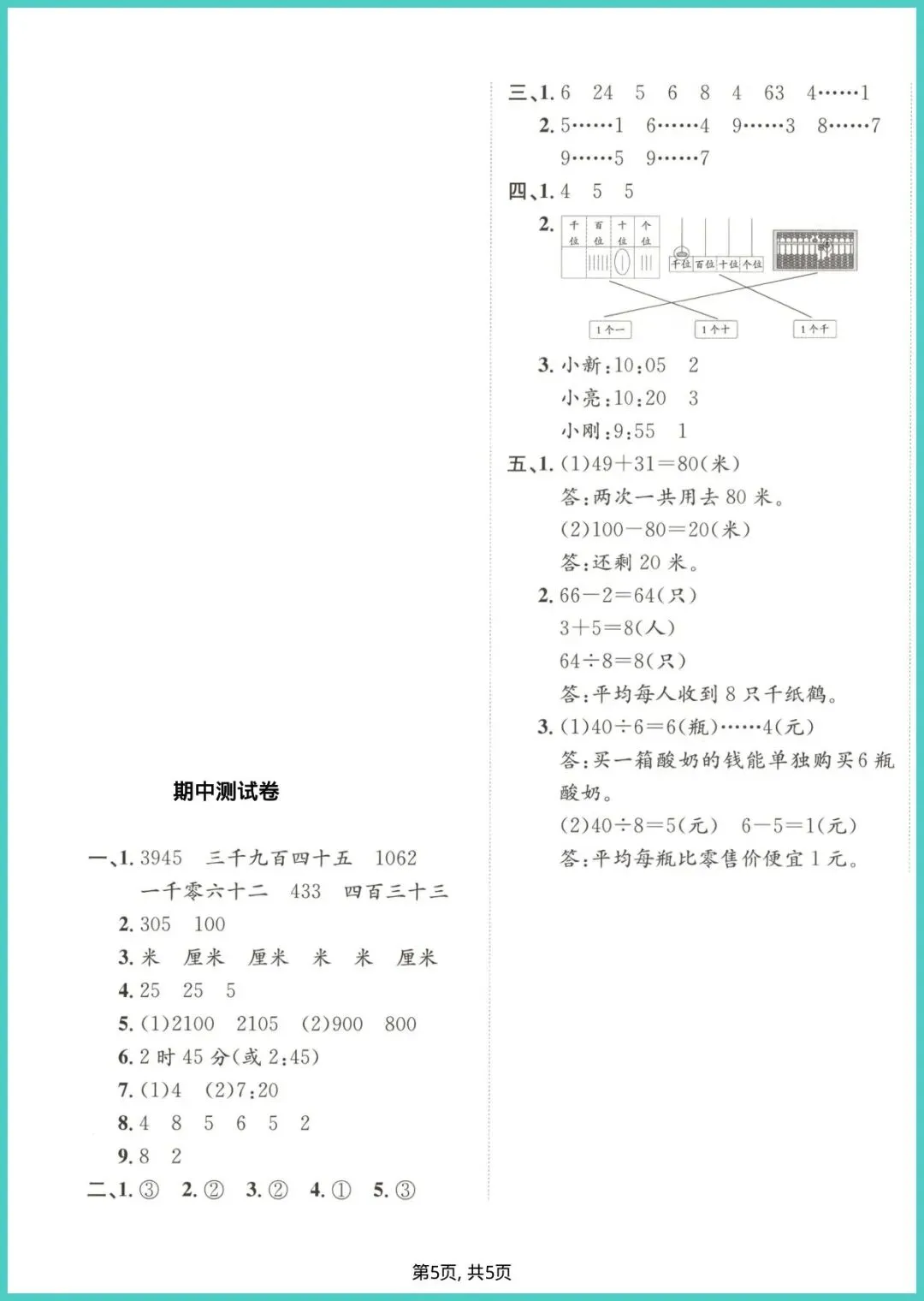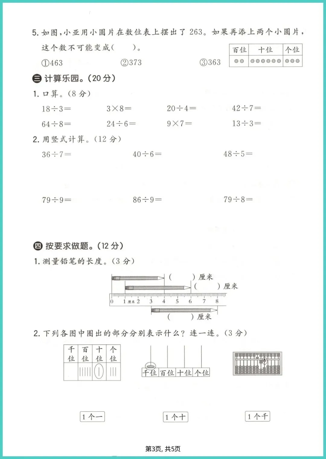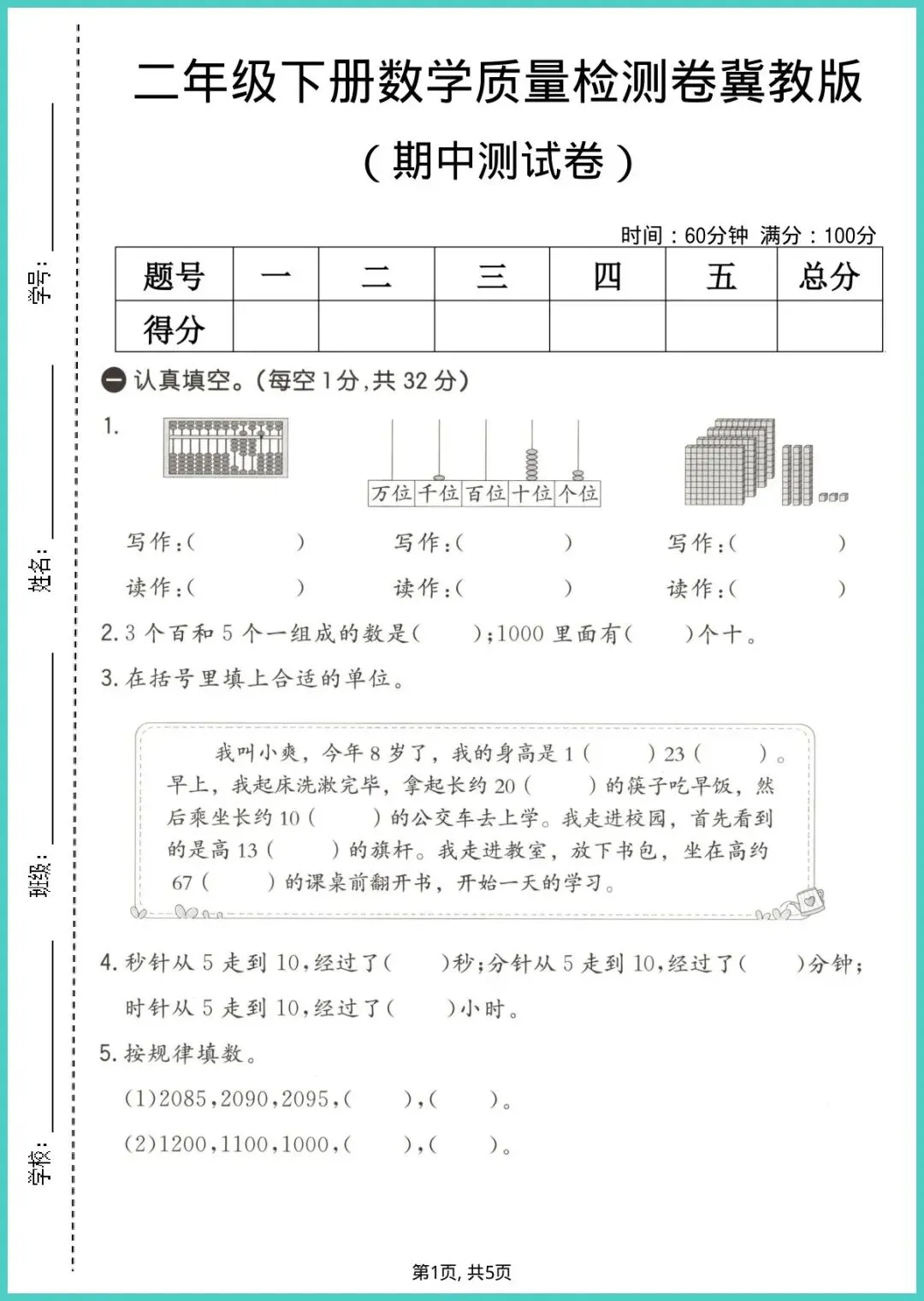 26年春冀教版二年级下册数学期中质量检测卷,5页电子版,一键就能打印!这份小卷紧贴冀教教材,把“表内除法、图形运动、万以内数”三大期中必考点一网打尽:前2页基础速算帮孩子稳口算,第3页易错判断专克粗心,第4页生活应用题提升读题力,末页标准答案评分标准,家长秒批不踩坑。每天10分钟,一周刷完,错题当场订正,期中稳拿高分!想让孩子自信进考场?现在就打印练起来!