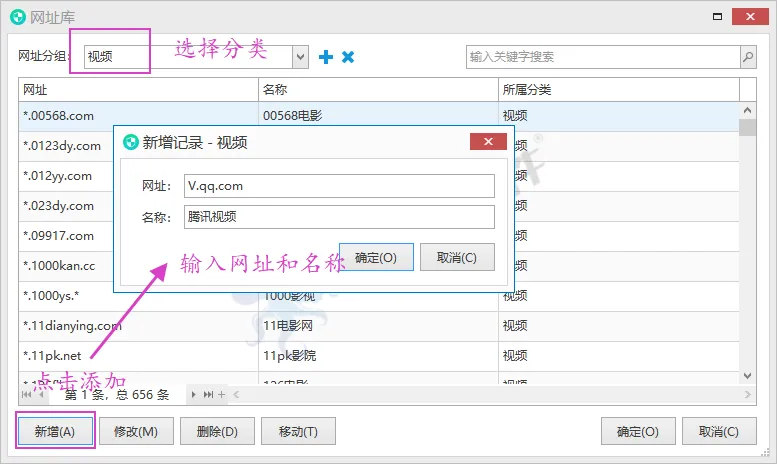 在网址库里可以添加需要禁用的网址,比如这个腾讯视频的网址,先建一个分类,比如视频,然后把腾讯视频网址添加进去。