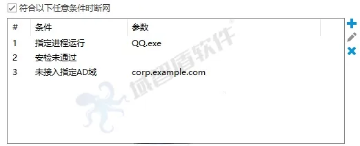 能设置断网条件,比如某程序运行、安检未通过、未接入指定AD域等,保证上网安全。