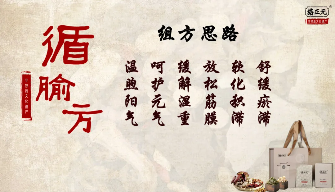 温煦阳气(驱寒湿)→ 呵护元气(补脾肾)→ 缓解湿重(化水湿)→ 舒缓瘀滞(通经络)→ 软化积滞(散瘀结)→ 放松筋膜(促循环)。