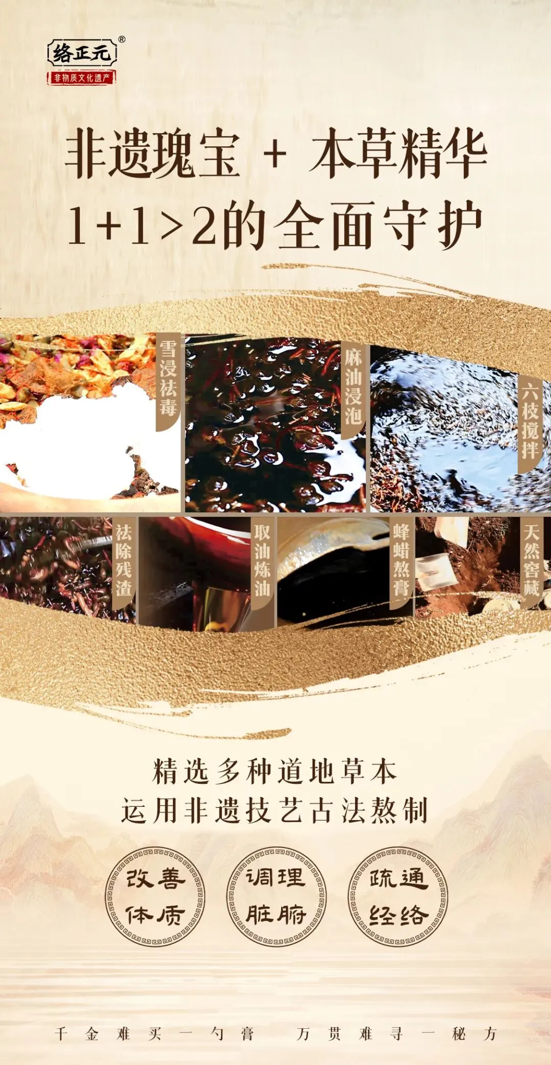 天然草本精选道地药材→太白山雪浸祛毒→麻油浸泡促渗透→六枝(桑槐桂艾桃柳)搅拌增阳→过滤残渣→加入高氏古法蜂蜡文火熬膏→山泉土埋天然窖藏→八道品控层层检验。每一道工序不省人工、不省物力。