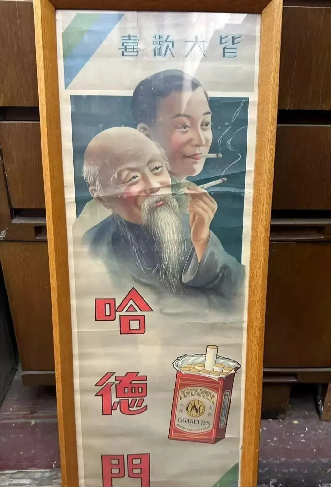 那广告画真有意思,老头老太太都抽,烟搭桥,酒铺路,心事还需自己悟,竖版的海报挂在墙上,像是家里的一个老物件,看着就亲切,那笑容里藏着多少故事。