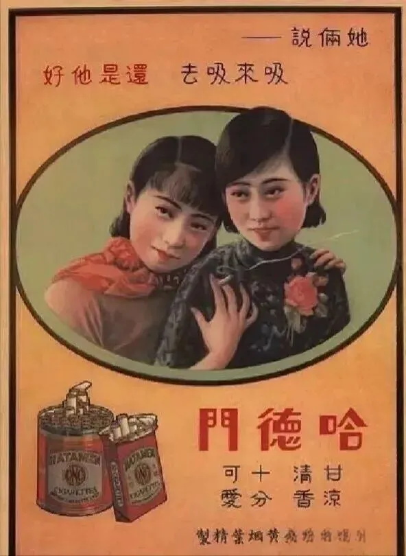 两个女子依偎在一起,那月份牌画得真讲究,是人都抽哈德门,那时候广告没少投入,这画儿就是最好的招牌,看着就让人心里暖和,像是回到了那个慢悠悠的年代。