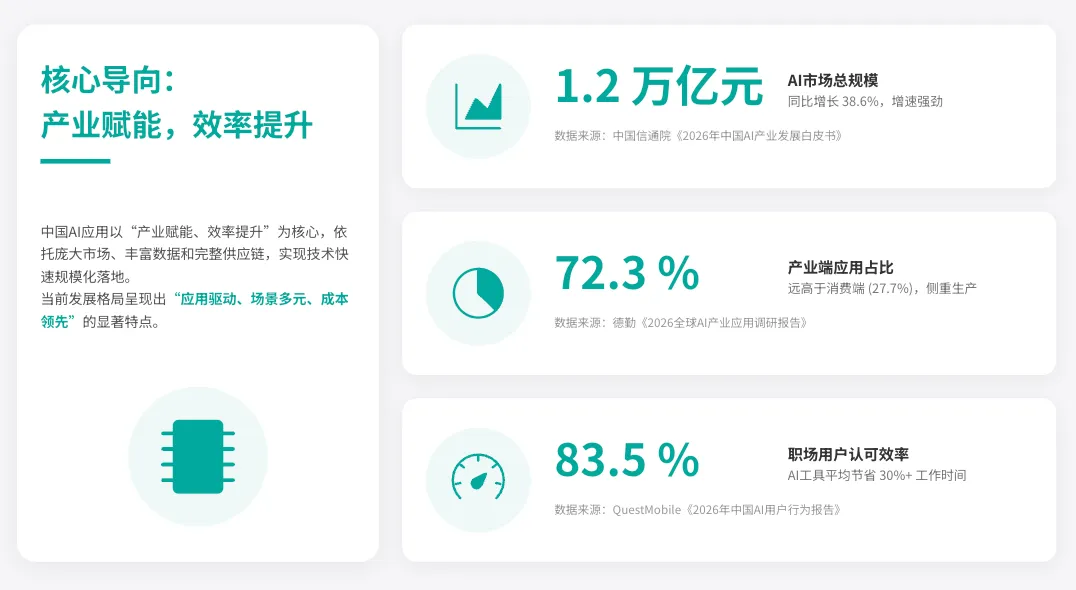 中国AI应用以“产业赋能、效率提升”为核心导向,依托庞大的市场规模、丰富的数据资源和完整的制造业供应链,实现了技术的快速规模化落地。当前,中国AI格局呈现“应用驱动、场景多元、成本领先”的特点,主流应用集中在产业领域,AI被广泛视为职场人群提升效率的“生存工具”,据中国信通院《2026年中国AI产业发展白皮书》数据显示,中国AI市场规模已达1.2万亿元,同比增长38.6%,同时在技术适配性和商业化落地方面形成独特优势,未来将持续聚焦国产算力替代与全球化场景拓展。