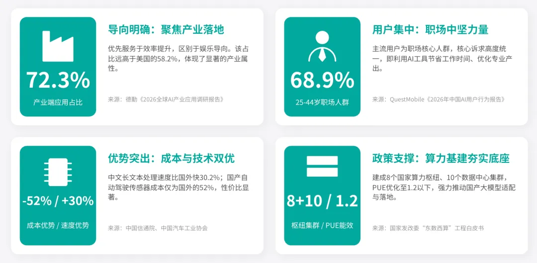 1. 导向明确:以产业落地为核心,优先服务于效率提升,区别于部分国家的娱乐、情感导向,核心目标是通过AI赋能制造业、医疗、金融等领域,降低运营成本、提升产出效率。据德勤《2026全球AI产业应用调研报告》显示,中国AI产业应用中,产业端占比达72.3%,消费端(娱乐、情感)占比仅27.7%,远低于美国的58.2%。