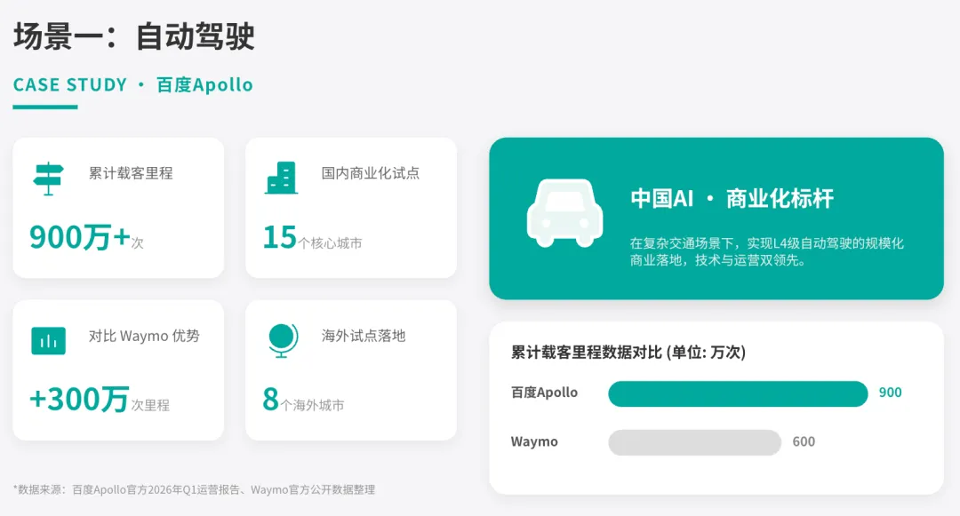 1. 自动驾驶:百度Apollo的载客里程已超过900万次,远超美国Waymo的600万次(数据来源:百度Apollo官方2026年Q1运营报告、Waymo官方公开数据),在国内15个城市实现商业化试点,同时逐步向海外拓展,适配不同国家的道路场景和出行需求,海外试点城市已达8个。
