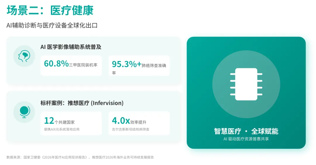 2. 医疗健康:三甲医院AI医学影像辅助系统的装机率已超过60.8%(数据来源:国家卫健委《2026年医疗AI应用现状报告》),在肺癌筛查等场景中准确率可达95.3%以上,大幅提升诊断效率;推想医疗的便携AIX光系统已出口至12个共建“一带一路”国家,解决偏远地区疾病筛查难题,其中在吉尔吉斯斯坦,该系统使当地结核病筛查效率提升4倍(数据来源:医疗2026年海外业务报告)。