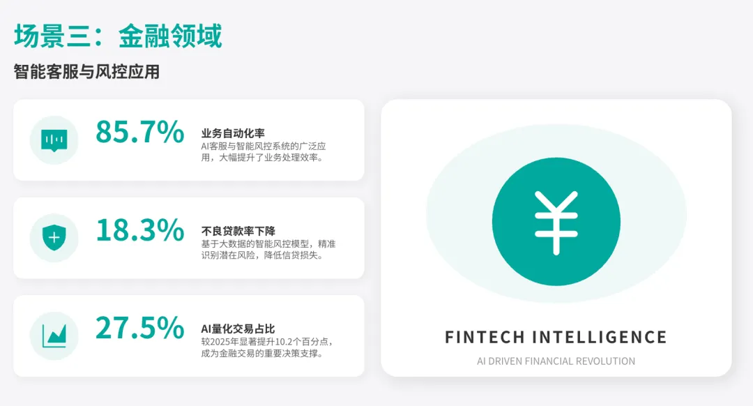 3. 金融领域:银行AI客服与智能风控的自动化率普遍达到85.7%以上(数据来源:中国银行业协会《2026年银行AI应用发展报告》),有效降低运营成本和信贷风险,其中智能风控可使银行不良贷款率下降18.3%;同时AI量化交易、智能理财等应用逐步普及,AI量化交易占比已达27.5%,较2025年提升10.2个百分点(数据来源:中国证券业协会)。
