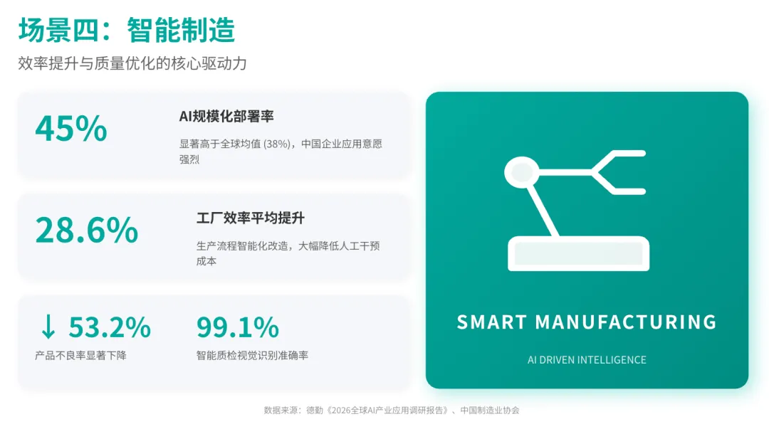 4. 智能制造:45%的受访企业已实现AI规模化部署,高于全球38%的均值(数据来源:德勤《2026全球AI产业应用调研报告》),工厂效率平均提升28.6%,不良率下降53.2%,AI在智能质检、预测性维护、智能排产等环节的应用已成为行业标配,其中智能质检的准确率达99.1%,较人工质检提升32%(数据来源:中国制造业协会)。