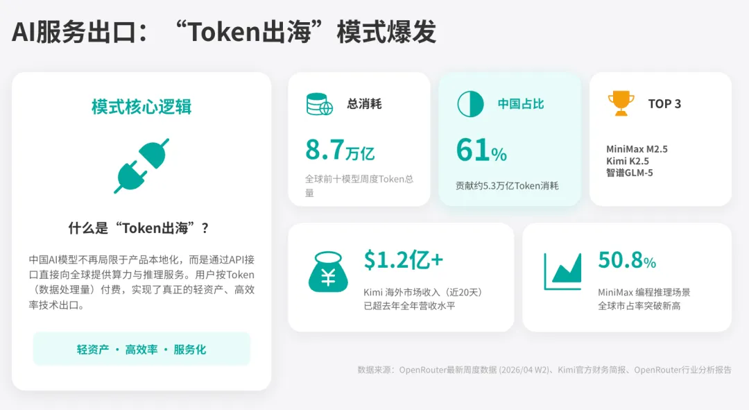 5. AI服务出口:“Token出海”模式呈现爆发式增长,据OpenRouter最新周度数据(2026年4月第2周)显示,全球前十AI模型总Token消耗约8.7万亿,中国模型独占5.3万亿,占比高达61%,MiniMax M2.5、Kimi K2.5、智谱GLM-5包揽榜单前三,其中Kimi模型近20天海外收入已超2025年全年总和,达1.2亿美元(数据来源:Kimi官方财务简报),MiniMax在编程推理场景全球市占率突破50.8%(数据来源:OpenRouter行业分析报告)。