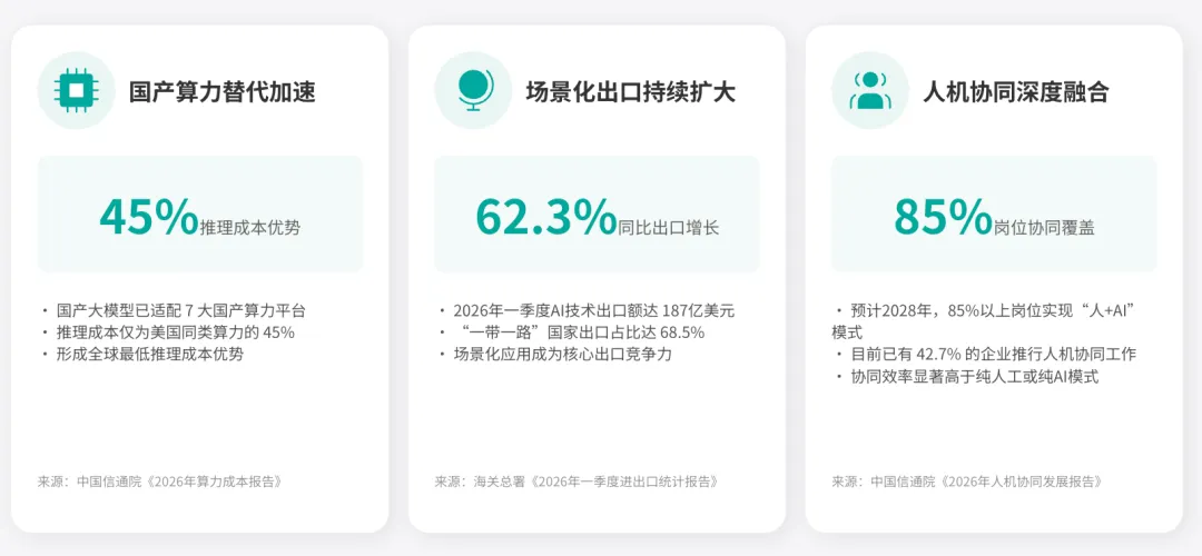 1. 国产算力替代加速:智谱GLM-5等国产大模型已完全适配华为昇腾、摩尔线程等7大国产算力平台,结合算力新城的能效优势,实现单机8000tokens/s的大模型推理性能突破,形成全球最低推理成本,仅为美国同类算力成本的45%(数据来源:中国信通院《2026年算力成本报告》),进一步降低AI应用门槛。