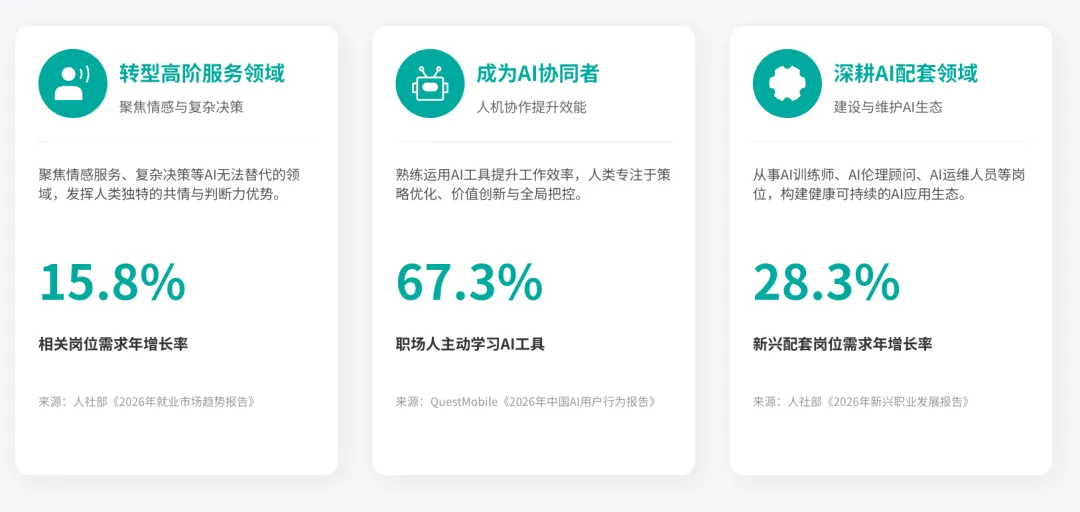 3. 深耕AI配套领域:从事AI训练师、AI伦理顾问、AI运维人员等岗位,这类岗位需求年增长率达28.3%(数据来源:人社部《2026年新兴职业发展报告》),依托专业知识和实践经验,为AI技术的优化和落地提供支撑,这类岗位无法被AI自我替代。