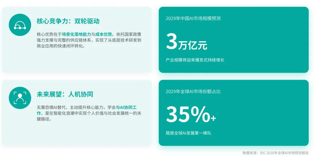 中国AI应用的核心竞争力在于场景化落地能力和成本优势,依托政策支撑和完整供应链,实现了从技术研发到商业化应用的快速转化。据IDC预测,到2029年,中国AI市场规模将突破3万亿元,占全球市场份额的35%以上。未来,随着国产算力替代的推进和海外市场的拓展,中国AI将在全球格局中占据更重要的地位。对于人类而言,无需恐惧AI替代,只需主动提升核心能力,学会与AI协同,即可在AI时代实现个人价值与社会价值的统一。
