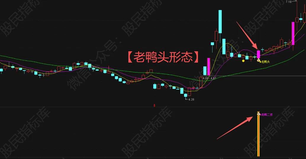 此形态是通过计算均线的特定交叉、排列与时间顺序,自动捕捉谷价在上升趋势中的短期整理(形成“鸭头”)后再次启动上涨(“张嘴”)的信号。