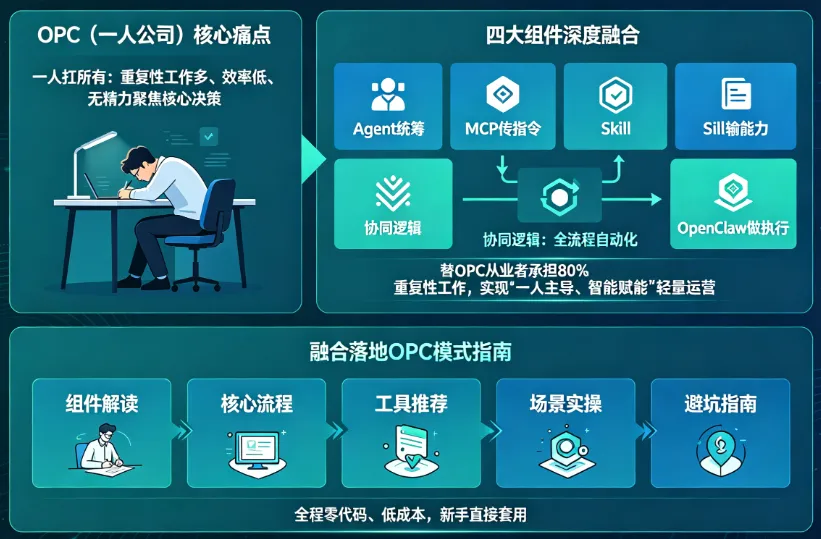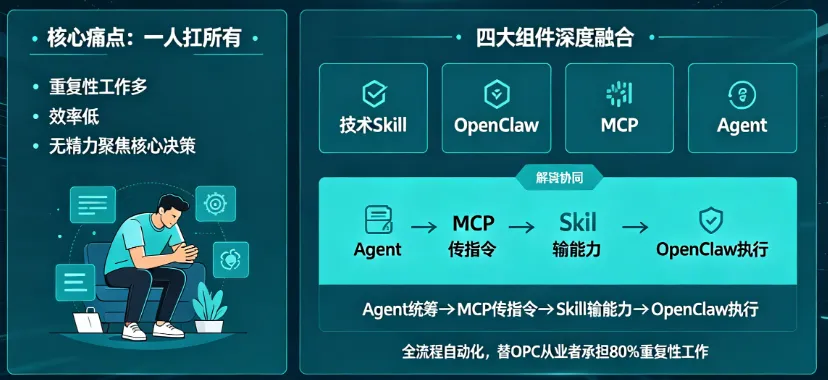 OPC(一人公司)模式的核心痛点的是“一人扛所有”,重复性工作多、效率低、无精力聚焦核心决策;而技术Skill、OpenClaw、MCP、Agent四大组件的深度融合,正是解决这一痛点的关键——通过“Agent统筹、MCP传指令、Skill输能力、OpenClaw做执行”的协同逻辑,让智能体实现全流程自动化,替OPC从业者承担80%的重复性工作,真正实现“一人主导、智能赋能”的轻量运营模式。