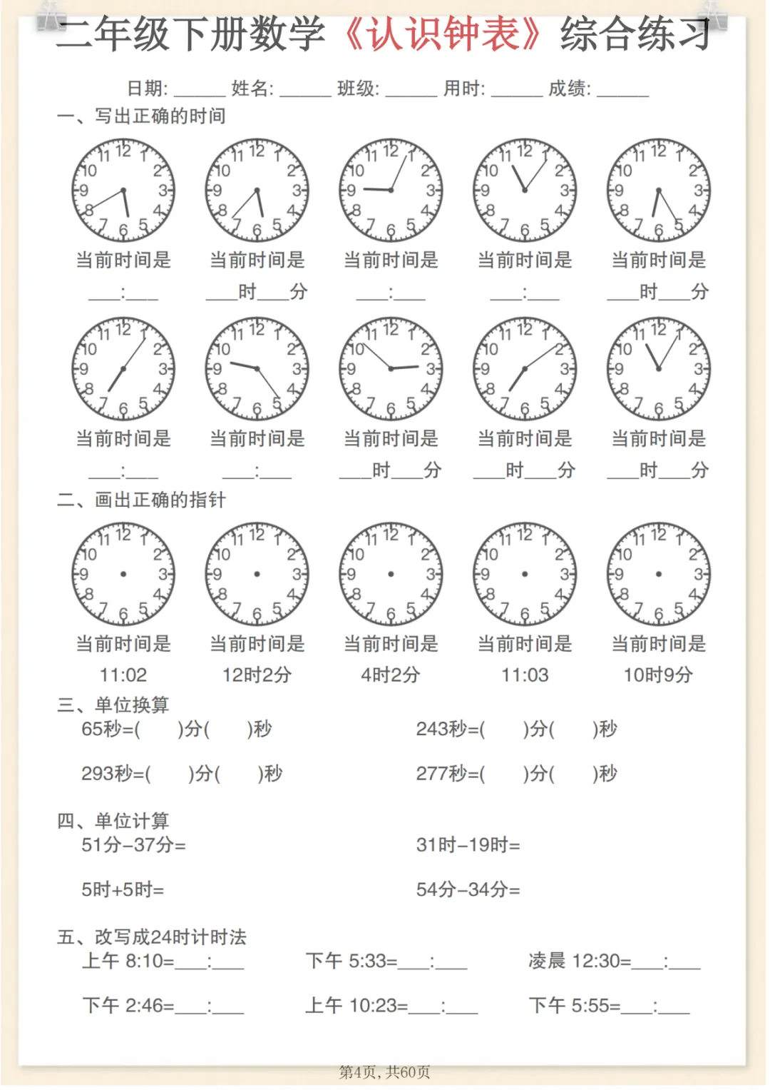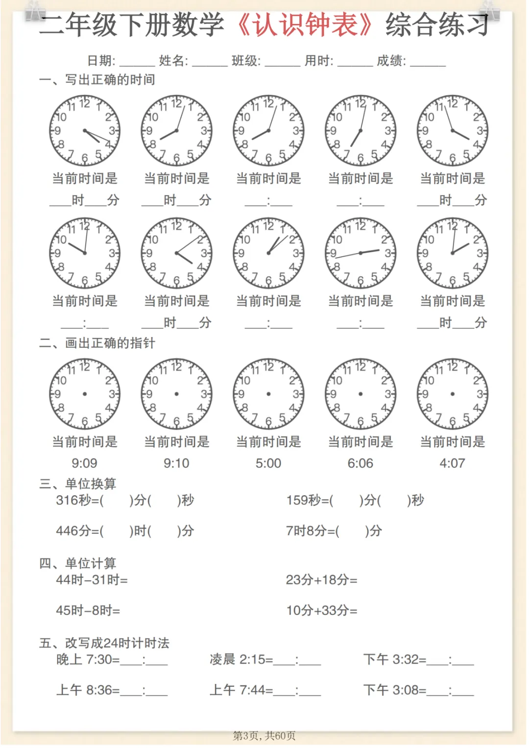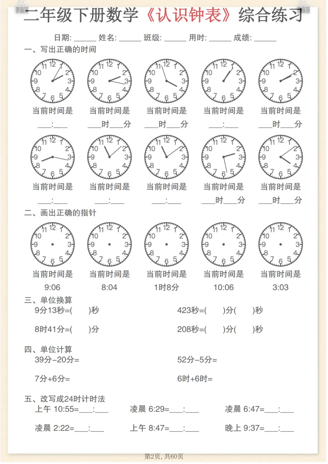 二年级下数学《认识钟表》综合练习,电子版可打印 None (温馨提示:文末有完整领取方式) 免费领取完整电子版 ①:点一点右下角的“赞”和“在看”,感谢!②:在公众号对话框中回复: 8710 ③: 点击小程序领取→电子版资料