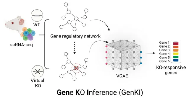 有没有一种方法,能在不进行任何物理实验的情况下,仅凭计算机模拟就精准预测基因敲除的后果?2023年发表在《核酸研究》(Nucleic Acids Research)上的一项研究给出了肯定的答案。来自德州农工大学等机构的研究团队开发了一款名为 GenKI(Gene Knockout Inference) 的虚拟基因敲除工具,它仅需野生型(正常)细胞的单细胞RNA测序数据,就能准确推断基因功能,为基因研究开辟了一条全新的“计算实验”路径。