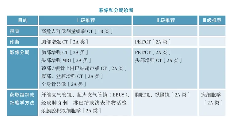 胸部增强CT、腹部、盆腔增强CT、头部增强MRI或增强CT及全身骨显像是SCLC分期和诊断的主要方法。对于下列情况,有条件者推荐使用PET/CT:①肺癌治疗前分期,PET对于淋巴结转移和胸腔外转移(脑转移除外)有更好的诊断效能;②辅助鉴别常规CT无法判断的肿瘤术后瘢痕与肿瘤复发,如PET/CT摄取增高,需活检证实;③辅助鉴别常规CT无法判断的肿瘤放疗后纤维化与肿瘤残存/复发,如PET/CT摄取,需活检证实。FDG-PET/CT对分期诊断有较好的效能,近期研究显示PET/CT可以改善SCLC患者的分期和治疗计划;另外有临床试验和随机对照研究发现,肺癌患者通过FDG-PET/CT扫描可以降低17%~20%的开胸率。但由于PET/CT价格昂贵,故仅作为Ⅱ级推荐;SCLC诊断时脑转移的发生率为10%~18%,其中,近30%的患者无脑转移相关症状,PET/CT在发现脑转移方面不如MRI或者CT。Seute等对比了不同时期481例SCLC患者脑转移发生的流行病学数据,发现在CT时期SCLC脑转移的发生率为10%,而核磁时期发生率高达24%,其中11%的患者为无症状脑转移,并且多发脑转移的检出率也明显增高。当纵隔淋巴结或浆膜腔积液影响治疗决策,而现有手段又难以确认时,推荐EBUS、浆膜腔积液穿刺等有创手段明确纵隔淋巴结或浆膜腔积液性质;痰细胞学由于容易产生诊断错误,在组织学检查可行的情况下,应减少痰细胞学的应用。