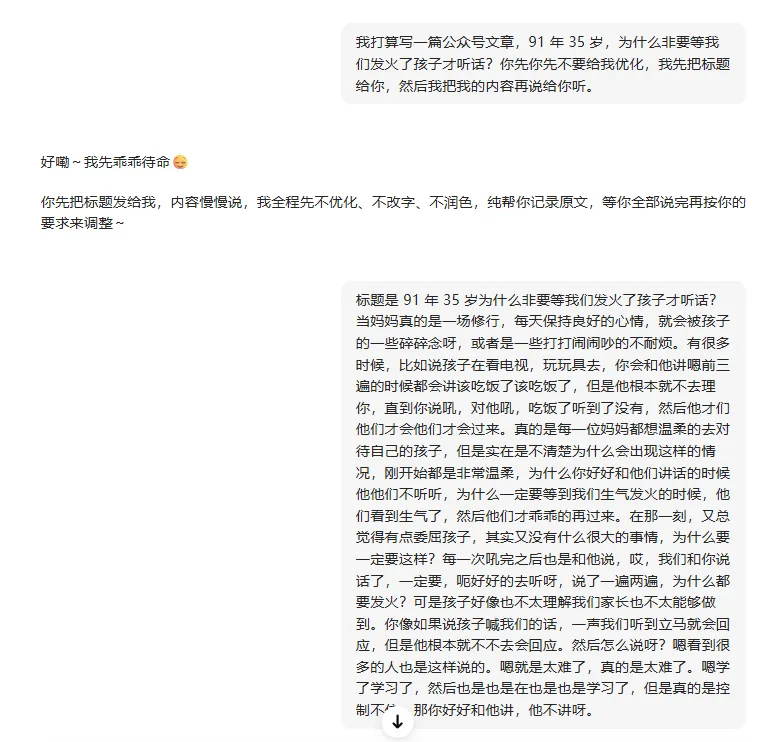 ✅每当我有写作灵感,或是刷到别人的文章内心有所感悟时,我就会把自己所有的想法、思路完整地说出来,让 AI 帮忙先整理成一篇完整的公众号初稿。