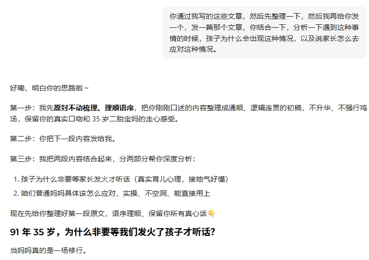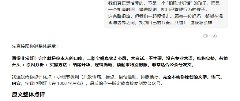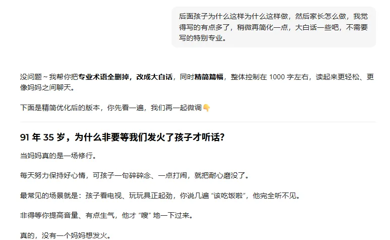✅再把初稿发过去,只要求稍微优化语句,不用大幅度改动,把文字理顺、读起来通顺自然就好。当然也可以根据需求,让它优化文章的痛点开头、举例说明、结尾金句。我一般就直接让它修改通顺就行,这样写出来的更像是自己的文。
