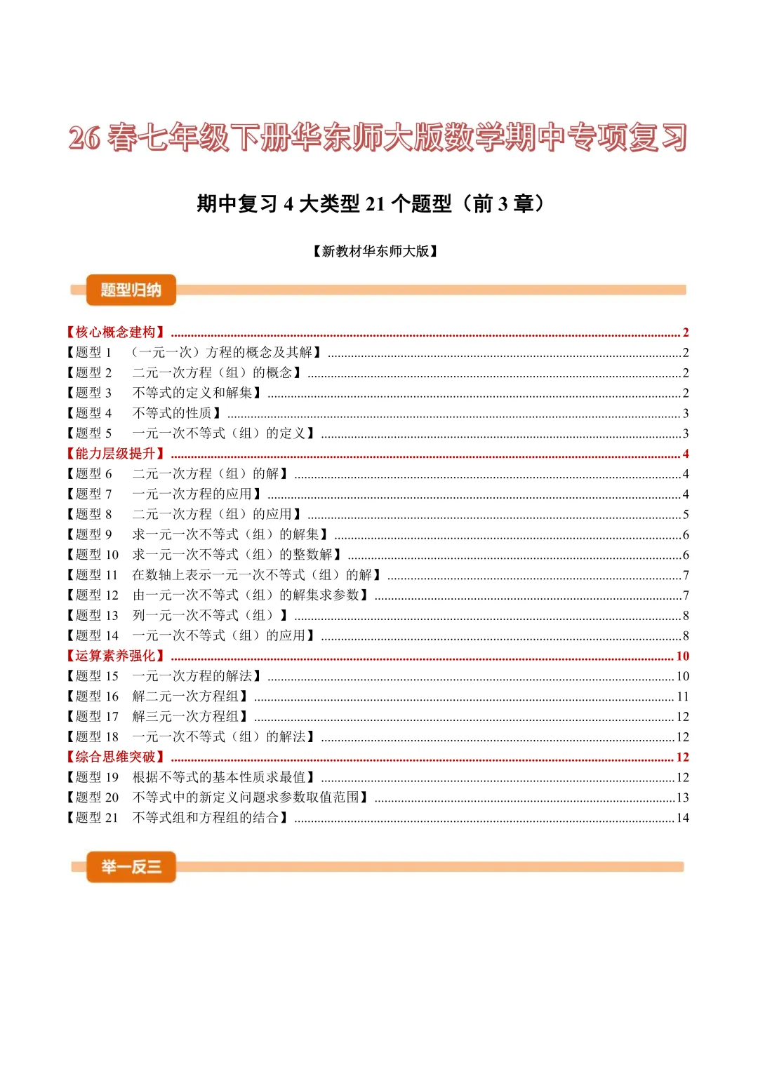 【初中资料】26 春七年级下册华东师大版数学《期中复习专项训练含 4 大类型 21 个常考题型有答案》📐专为期中备考打造,涵盖二元一次方程组、一元一次不等式、平移与旋转、整式乘除四大核心专题。21 个高频常考题型精准对标期中考点,由基础到提升层层递进,直击易错与重难点。每道题型均附详细答案与解题步骤,思路清晰,方便孩子自主订正复盘。专项突破不盲目刷题,考前集中练透,期中数学轻松提分更稳妥💯