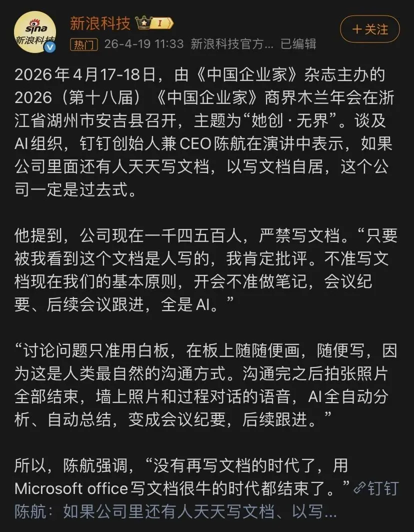 钉钉 CEO 陈航(花名无招)最近的一番演讲,直接把打工人整不会了。核心就一句: “只要被我看到这个文档是人写的,我肯定批评。”