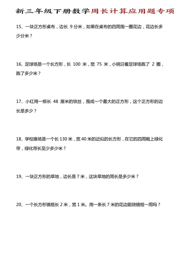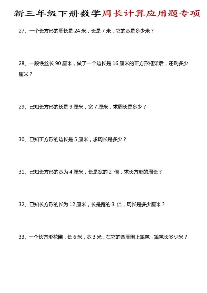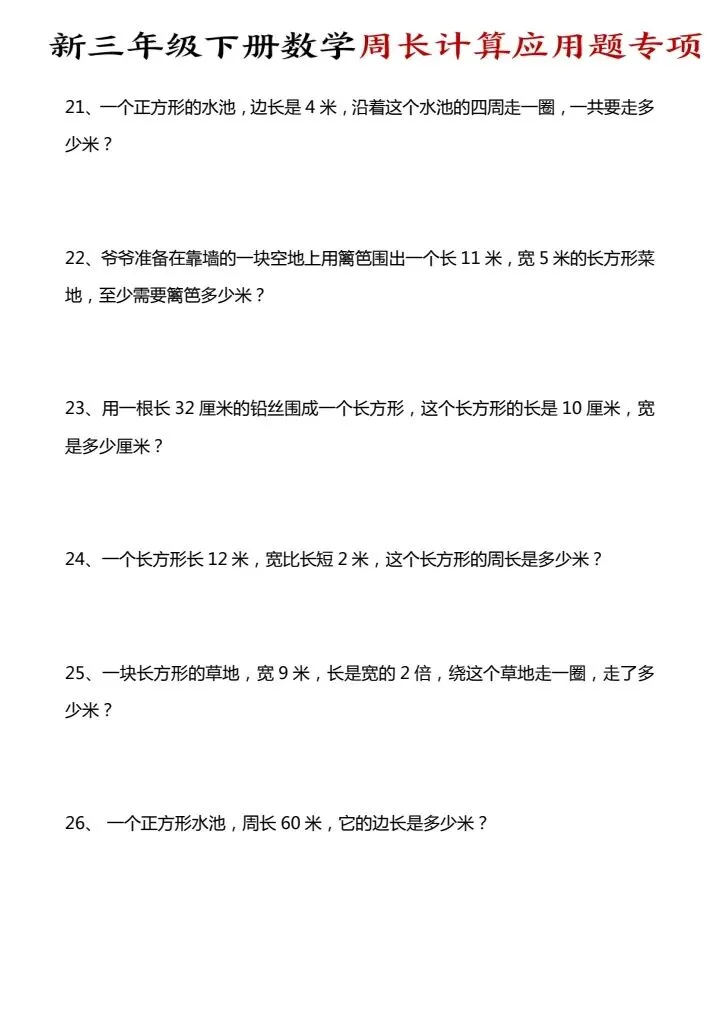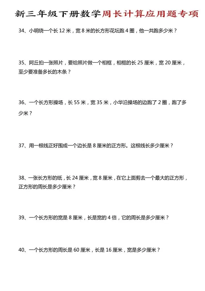 今日份分享三年级下册数学周长计算应用题专项(完整电子版可打印)!这份资料已经整理成可打印版本,方便孩子随时翻看学习,建议家长先收藏,再转发给身边有需要的家庭,一起帮助孩子高效学习~