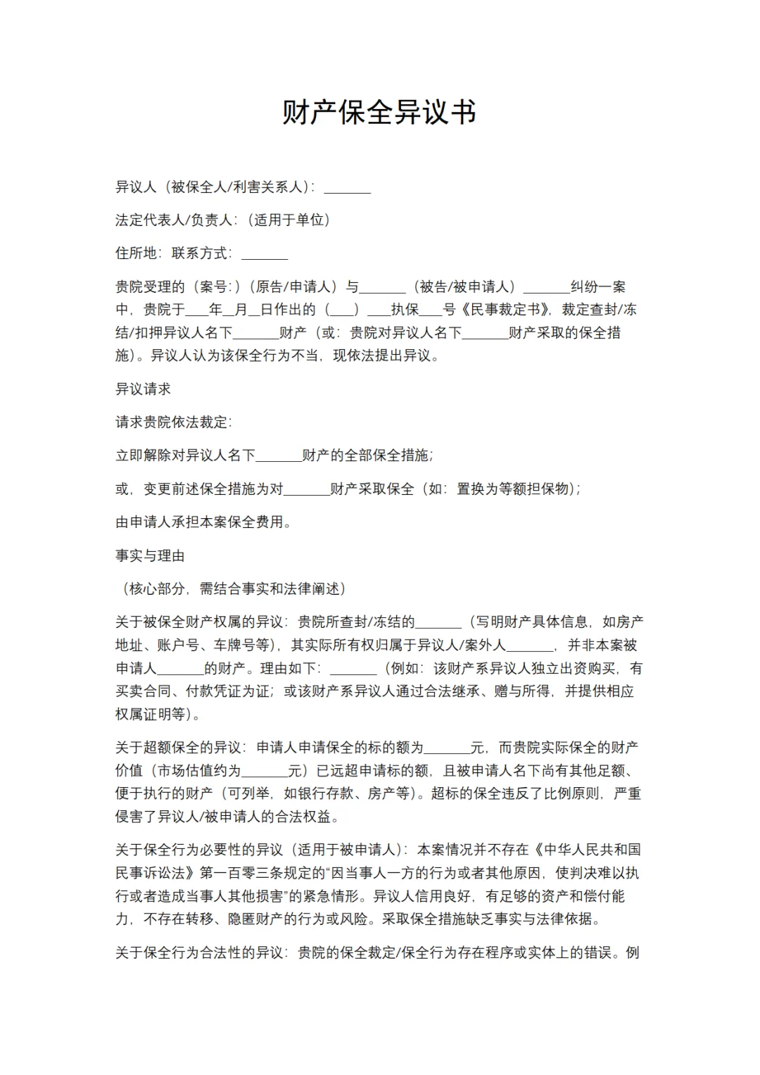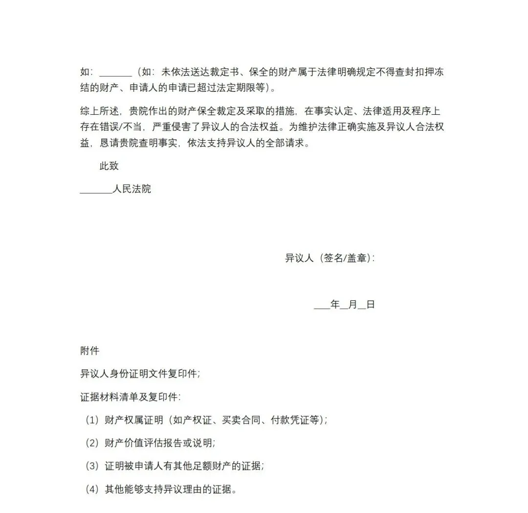 财产保全异议书模板,WORD文档电子版,可免费下载打印