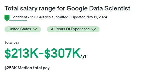 Google美国数据科学家年薪中位数253,000美金(约184万人民币)。