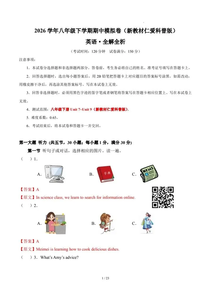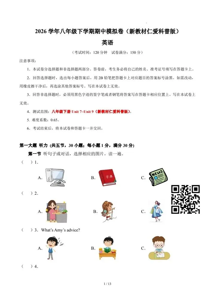 今日分享26新八年级下册英语仁爱版期中模拟卷(含答案)完整电子版可打印!高清可打印,每日轻量练习,拒绝无效刷题,用系统化资料筑牢学科基础,让假期成为提升的黄金期,开学轻松领跑。